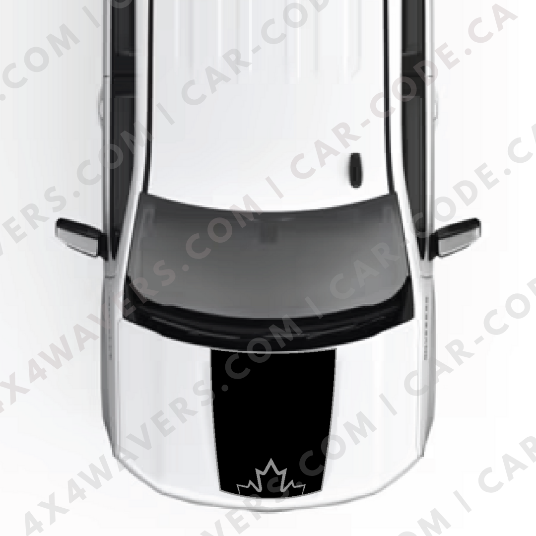 Pick Cut-Out or Solid Canada Style and choose your accent colour. Standard options include our full colour deck: neutrals, brights, metallics, and more. Need a different size for an aftermarket hood, scoop, or wrap, or want to add text or GPS coordinates along one of the panels? Send a message and we will adjust the template and send a digital proof before cutting.