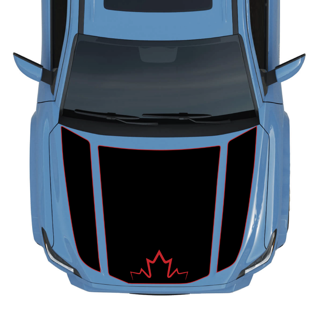 Pick Cut-Out or Solid Canada and choose your accent colour. Standard options include our full colour deck: neutrals, brights, metallics, and more. Need a different size for an aftermarket hood, scoop, or wrap, or want to add text or GPS coordinates along one of the panels? Send a message and we will adjust the template and send a digital proof before cutting.