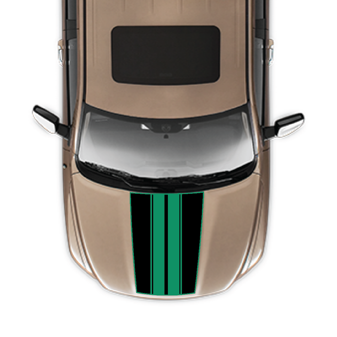 This three-piece hood panel kit fills the center of the hood and both outer wings with a deep matte black field and a sharp Racing Stripes outline. Each piece is sized specifically for the Ram 1500 2009-2018, so panel gaps and edges follow the factory lines for an almost OEM look. Choose Cut-Out (your paint shows through the Racing Stripes or Solid in your accent colour. We are using premium materials exclusively (3M, Avery, Oracal, Hexis).
